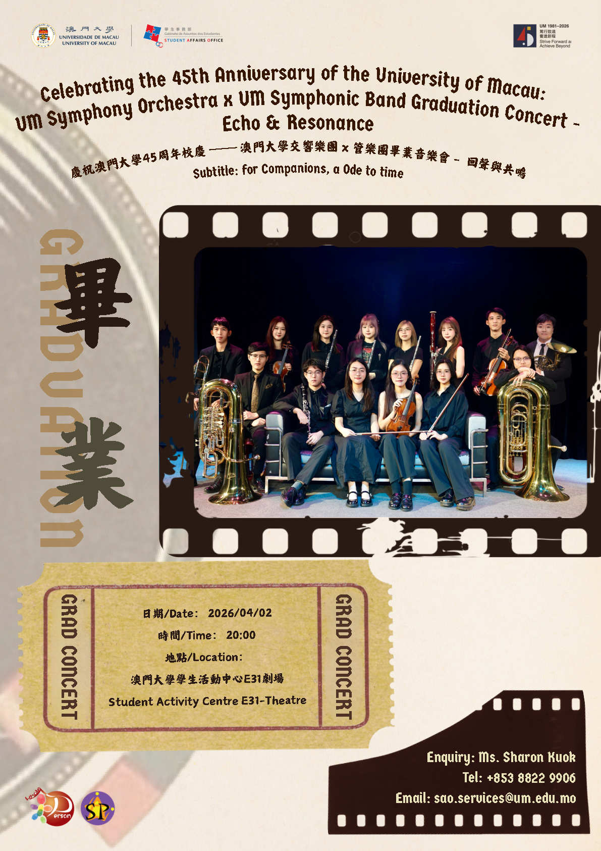 Concert Tickets – Celebrating the 45th Anniversary of the University of Macau: UM Symphony Orchestra x UM Symphonic Band Graduation Concert “Echo & Resonance” (Date: 02 April 2026, 20:00, E31- Student Activity Centre Theatre) 1SP & 15.0 “Cultural engagement” (CS) Gallery Concert Tickets – Celebrating the 45th Anniversary of the University of Macau: UM Symphony Orchestra x UM Symphonic Band Graduation Concert “Echo & Resonance” (Date: 02 April 2026, 20:00, E31- Student Activity Centre Theatre) 1SP & 15.0 “Cultural engagement” (CS) cna, News Concert Tickets – Celebrating the 45th Anniversary of the University of Macau: UM Symphony Orchestra x UM Symphonic Band Graduation Concert “Echo & Resonance” (Date: 02 April 2026, 20:00, E31- Student Activity Centre Theatre) 1SP & 15.0 “Cultural engagement” (CS) sharonkuok Kuok Un Pui2026-03-27T16:07:07+08:00March 27th, 2026|