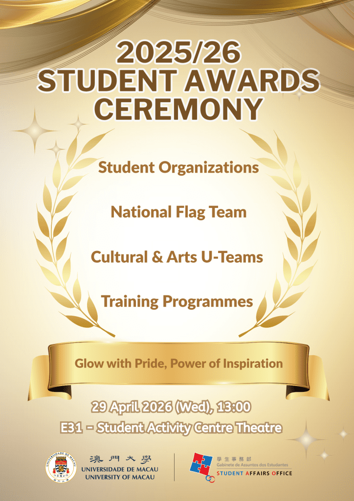 Invitation to 2025/2026 UM Student Awards Ceremony (29 April 2026, 13:00, E31 SAC Theatre) Gallery Invitation to 2025/2026 UM Student Awards Ceremony (29 April 2026, 13:00, E31 SAC Theatre) cna, News Invitation to 2025/2026 UM Student Awards Ceremony (29 April 2026, 13:00, E31 SAC Theatre) sharonkuok Kuok Un Pui2026-04-14T15:01:49+08:00April 14th, 2026|