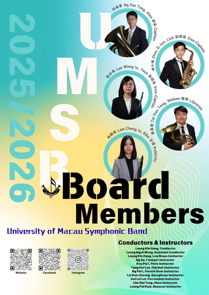 The University of Macau Symphonic Band (UMSB) was established in April 2007 and is the only college symphonic band among all higher education institutions in the Macao SAR. It is dedicated to providing formal training for students who are passionate about band music and to building a platform for performance and cultural exchange, thereby promoting arts and culture on campus and contributing to the development of band music in the local community. The Symphonic Band welcomes all UM students, exchange students from around the world, and alumni to join its rehearsals.